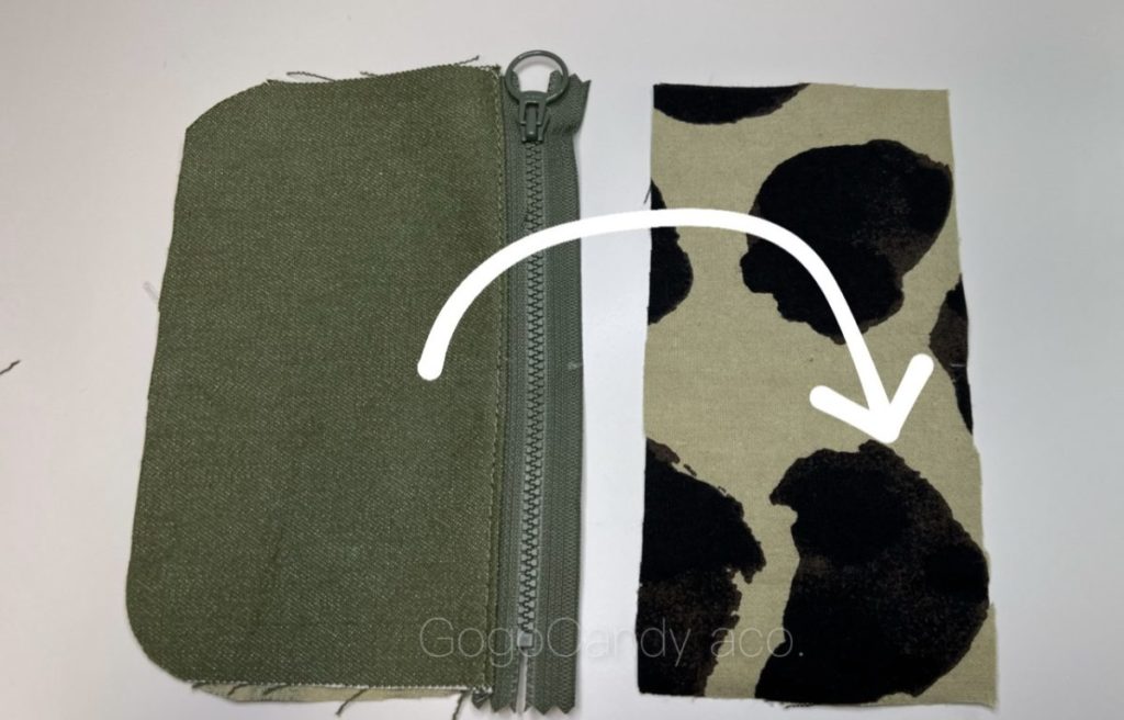 最初に作ったファスナー下部のパーツを、上部の生地2枚を中表にした状態で挟んでください。