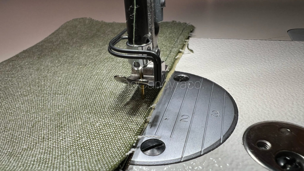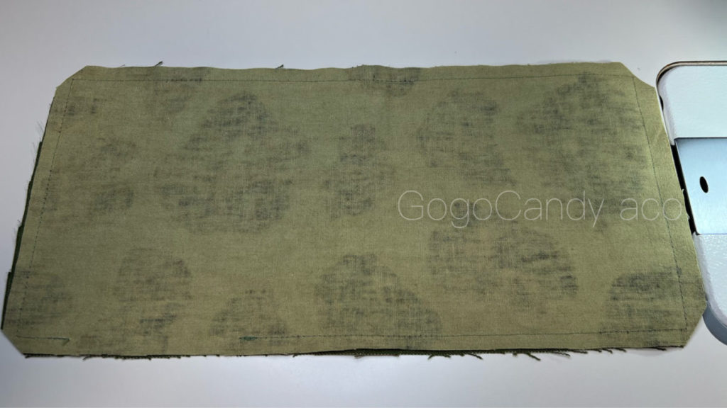 中表になっているフラップを表向きにひっくり返し、端にステッチを入れて縫い押さえます。