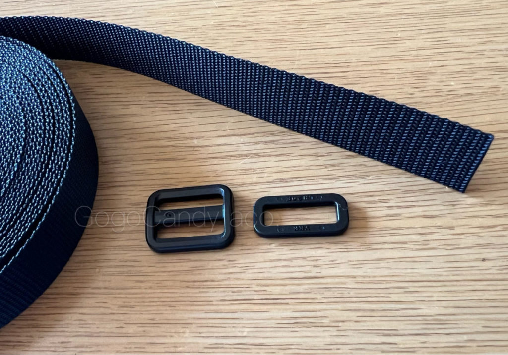 そしてそのテープ幅に合ったサイズのアジャスターと角カンをそれぞれ一つずつ用意してください。